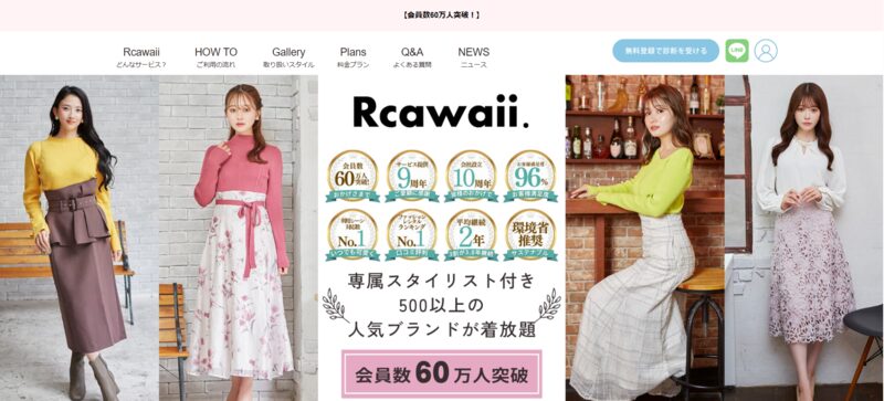 Rcawaii(アールカワイイ)は、10〜20代の女性に特に人気のある可愛い系ファッションに強いサブスクです。