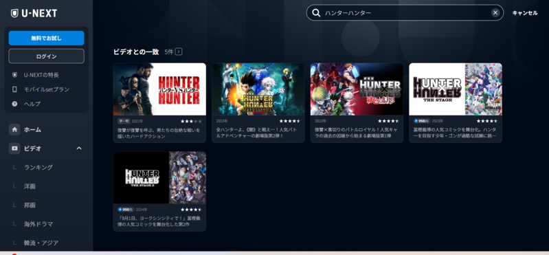 U-NEXTは月額2,189円(税込)と少し高めですが、ハンターハンターの新アニメ全話+劇場版2作品がすべて見放題です。