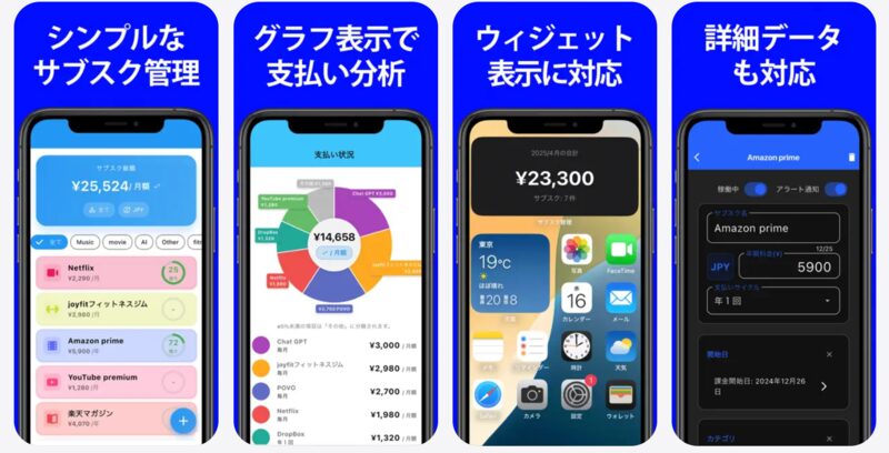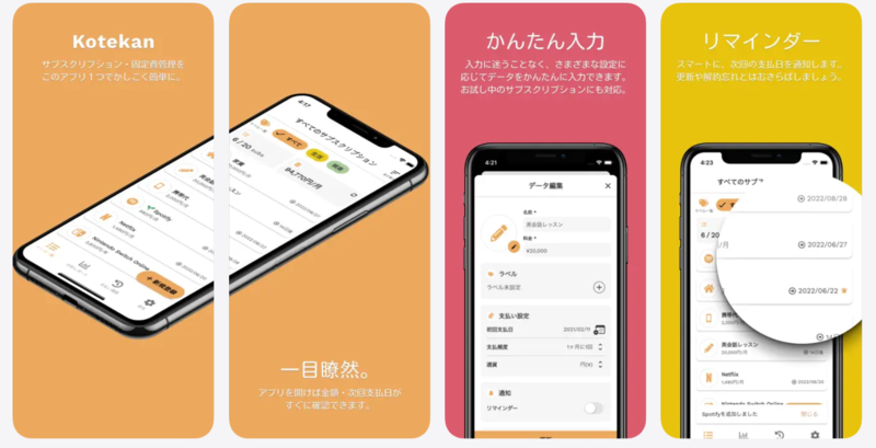 | サブスク管理(UPDEITO) | iPhone・Android | 手動入力 | あり | 広告削除:1,500円 | シンプルに管理したい人 |